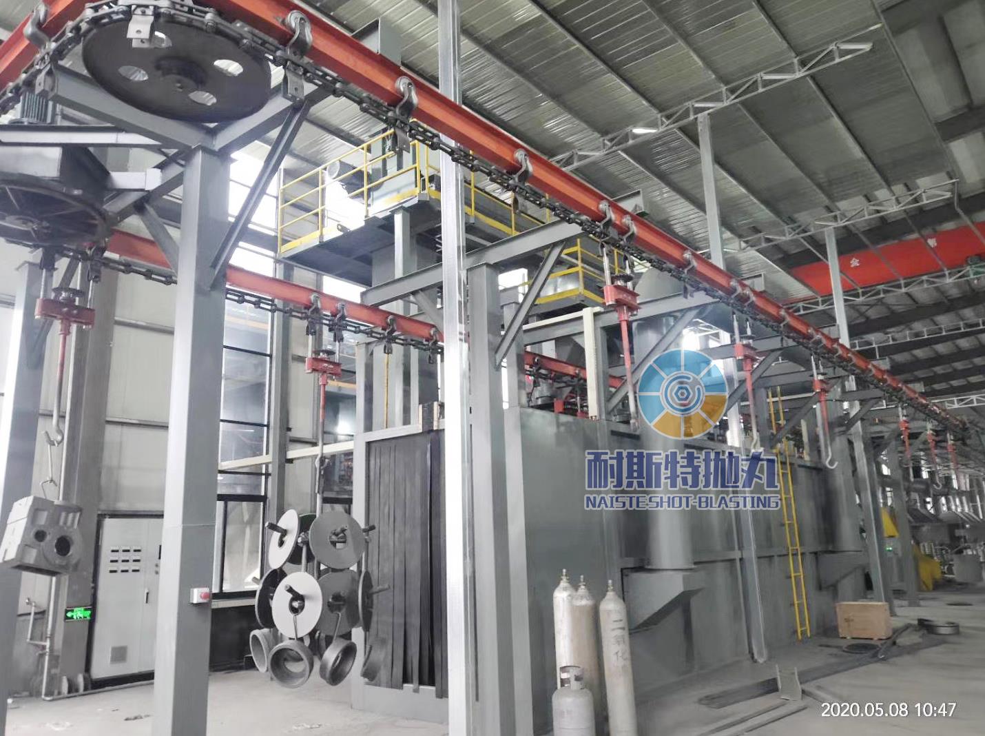 懸鏈通過式拋丸機(jī)適用于大批量的中小工件的拋丸處理。工件隨吊鏈可連續(xù)運(yùn)行、分步進(jìn)運(yùn)行、采用先進(jìn)的積放推式懸鏈輸送工件,使工件在加卸料和拋丸區(qū)分別處在停止的狀態(tài),實(shí)現(xiàn)了定點(diǎn)裝卸和定點(diǎn)拋丸的工序工作,其中單鉤吊重50~2000kg,并且它的生產(chǎn)率高,運(yùn)行可靠,對于一些表面和內(nèi)腔比較復(fù)雜的工件,如果發(fā)動機(jī)缸體缸蓋、電機(jī)殼體等清理效果很好。本產(chǎn)品使用汽車、拖拉機(jī)、柴油機(jī)、電機(jī)、閥門等行業(yè)。