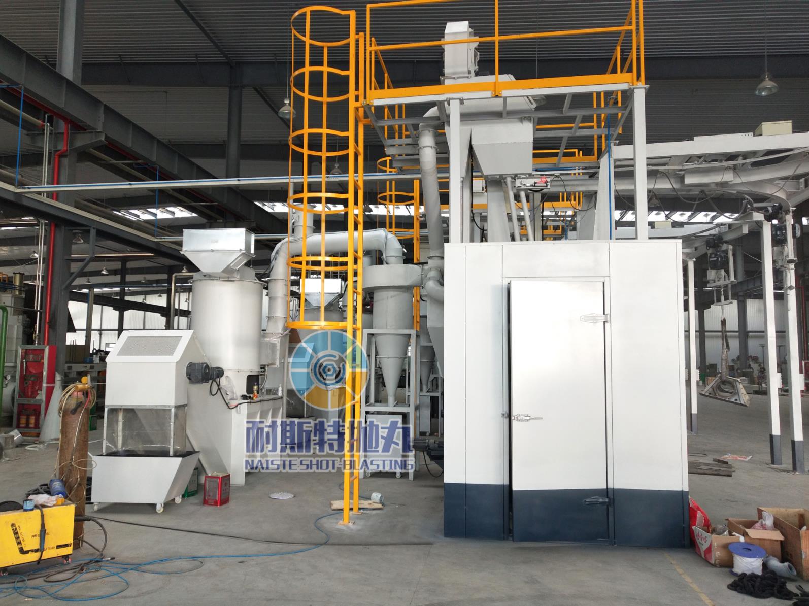利用除塵風機將含有粉塵的空氣吸入濕式除塵系統(tǒng)的進風口,利用文丘里原理及星形卸料器將大顆粒粉塵進行初步過濾分離,排出至本系統(tǒng)的預排塵箱。余下含有細顆粒的空氣進入正式水霧除塵的后續(xù)處理,在水霧與粉塵的充分混合后,含塵污水流入過濾水箱,通過沉淀形成淤泥,淤泥通過刮泥系統(tǒng)刮出到裝泥小車,污水通過污水處理系統(tǒng)凈化后再循環(huán)使用。