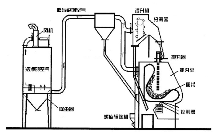 本機(jī)選用了Q034型皮帶傳動(dòng)形式的拋丸器,電機(jī)與拋丸器安裝成一個(gè)整體,結(jié)構(gòu)緊湊,占用面積小,同軸性強(qiáng),工作性能穩(wěn)定,彈丸流經(jīng)進(jìn)丸管后進(jìn)入高速旋轉(zhuǎn)的分丸輪,又從分丸輪窗口甩出,流經(jīng)集中在定向套窗口定向飛出,由高速旋轉(zhuǎn)的葉片承接并加速,最后從葉片端部甩出,去打擊與清除工件表面的粘著物。